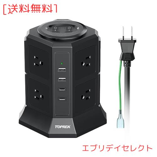 TOPREK 電源タップ 縦型コンセント 延長コード 3m タワー式 電源タップ usb付き コンセントタップ 8個AC口 4個USBポート Type-C付 ダブル
