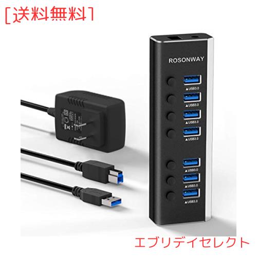 USBハブ 3.0 ROSONWAY アルミ製 7ポート USB3.0 Hub 24W電源付き バスパワーとセルフパワー両用 独立スイッチ 5Gbps高速転送、12V/2A AC