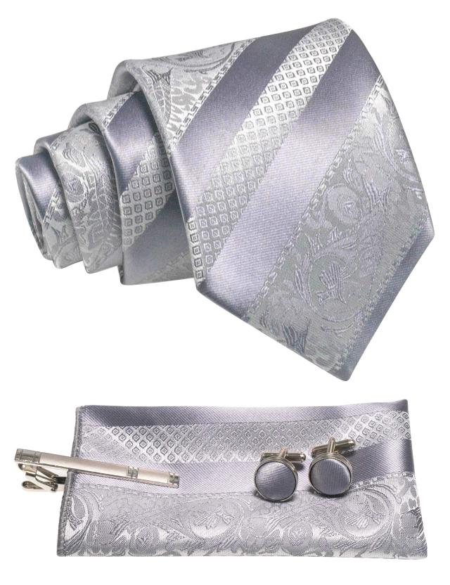 JEMYGINS メンズ ネクタイ グレー ストライプ ピン カフス ボタン チーフ ビジネス 就活 結婚式 入学式 卒業式 二次会 冠婚葬祭