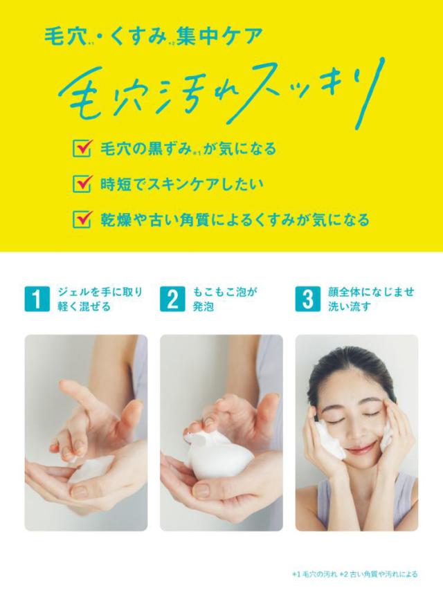 ・顔全体を軽く濡らし、適量を手に取り軽く混ぜると、ジェルが瞬時に泡になります。