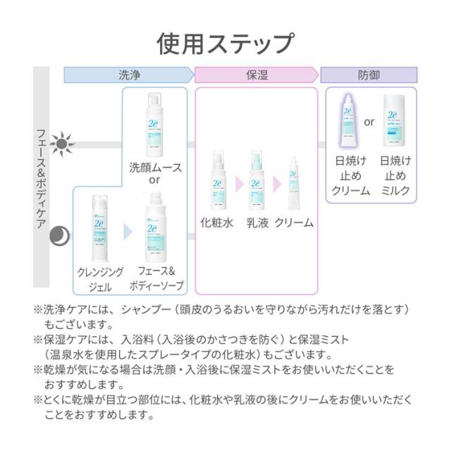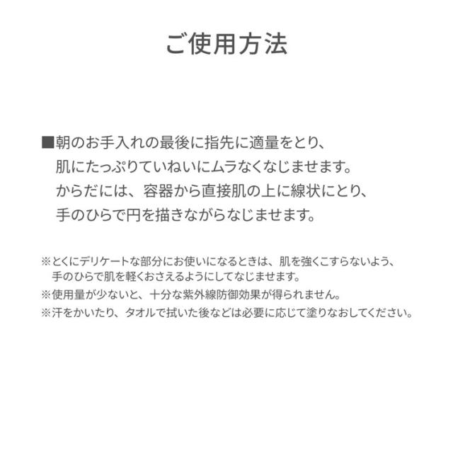 ・朝のお手入れの最後に指先に適量をとり、肌にたっぷりていねいにムラなくなじませます。からだには、容器から直接肌の上に線状にとり、手のひらで円を描きながらなじませます。