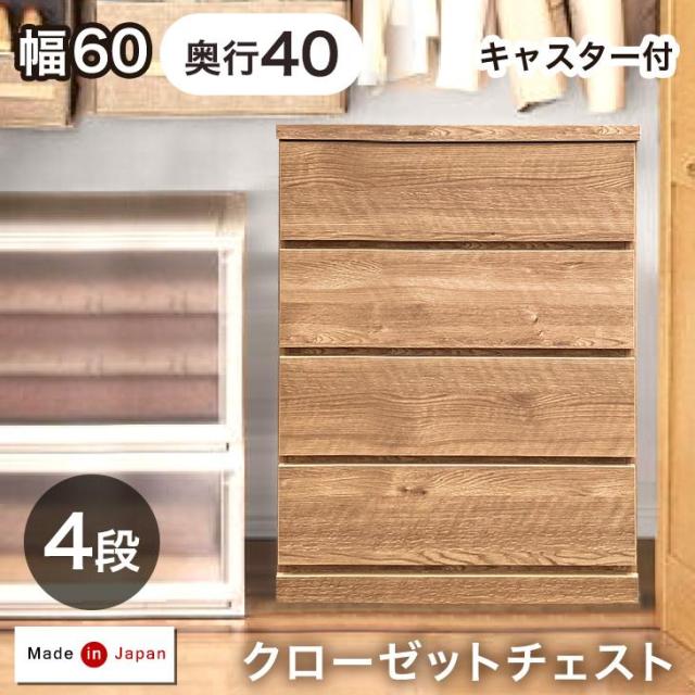 デッドスペース活用! キャスター付き クローゼットチェスト 4段 幅60 奥行40cm 完成品 日本製 チェスト クローゼット クローゼット収納 押入れ 押入れ収納 衣類収納 木製 キャスター 国産 60cm 60 ホワイト 白 ナチュラル 北欧