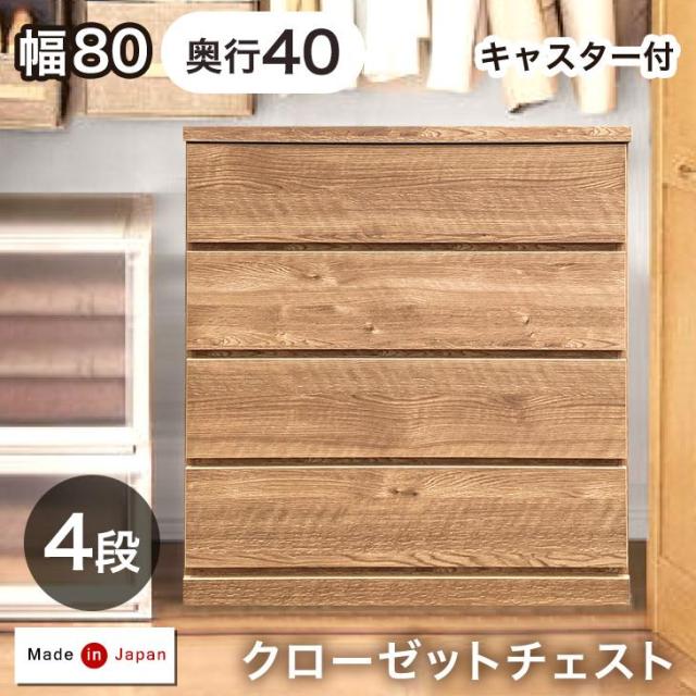 デッドスペース活用! キャスター付き クローゼットチェスト 4段 幅80 奥行40 完成品 日本製 チェスト クローゼット クローゼット収納 押入れ 押入れ収納 衣類収納 木製 キャスター 国産 80cm【超大型商品】【後払い・時間指定不可】