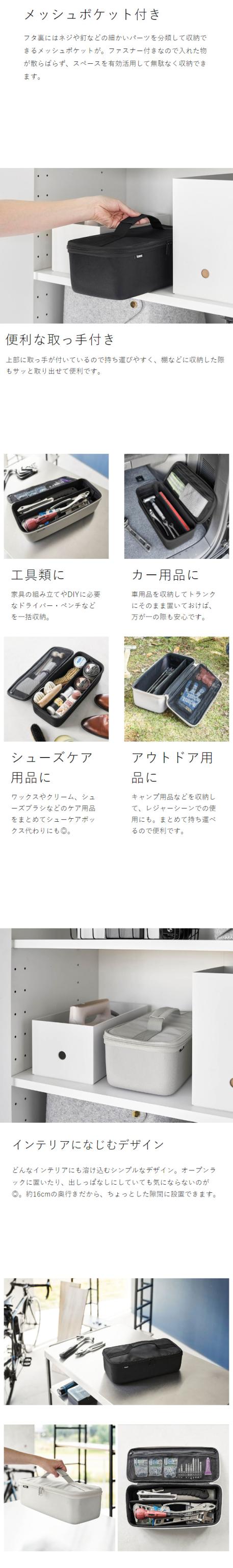 仕切りとポケットで仕分け収納ができるツールボックス。ダブルジッパーで大きく開いて、金槌やスパナなどの工具、車用品、アウトドア用品、シューケア用品などの収納にも活躍します。