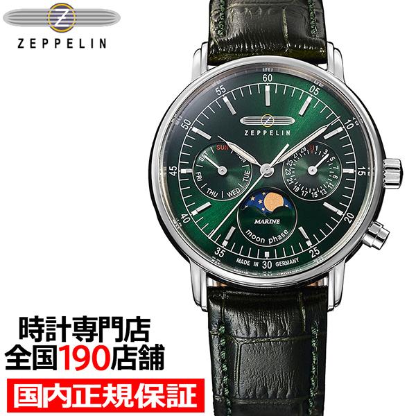 ツェッペリン LZ14 マリーネ 36mm ムーンフェイズ 8635-4 メンズ 腕時計 電池式 クオーツ グリーン 革ベルト デイデイト