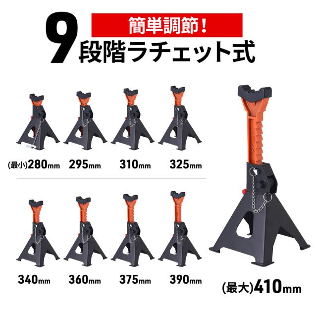 【 2基セット 】3t ジャッキ ジャッキスタンド 2基 2台 セット ラチェット式 低床 ジャッキアップ ジャッキダウン リジッドラック コンパクト 持ち運び 耐久性 タイヤ交換 オイル交換 自動車用 ジャッキ 固定 9段階 調節可能 タイヤ サスペンション 修理 交換