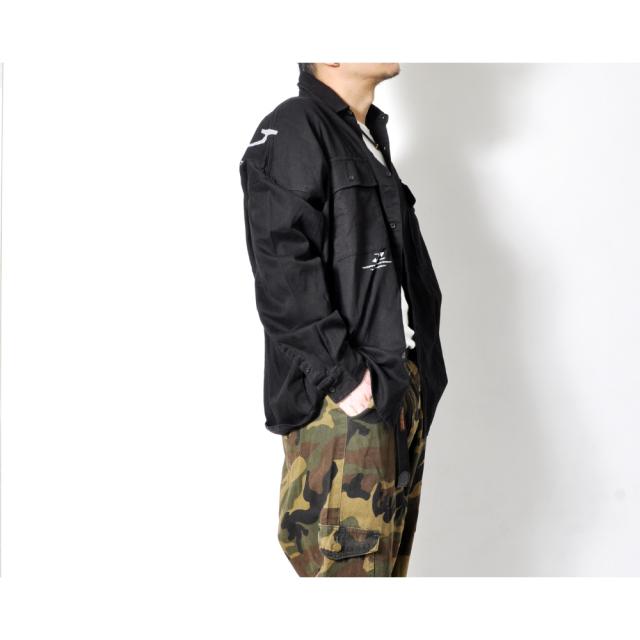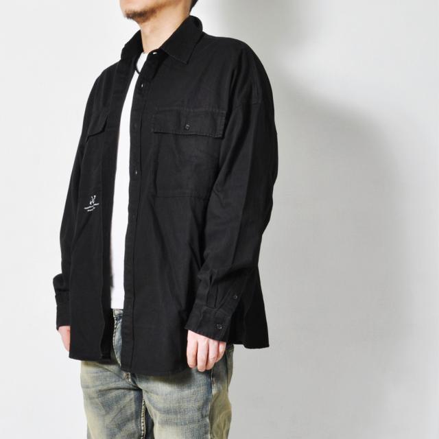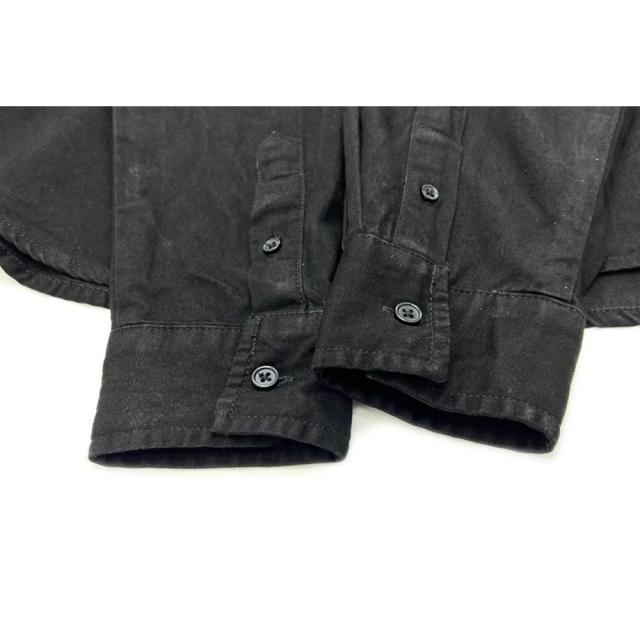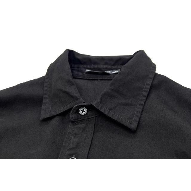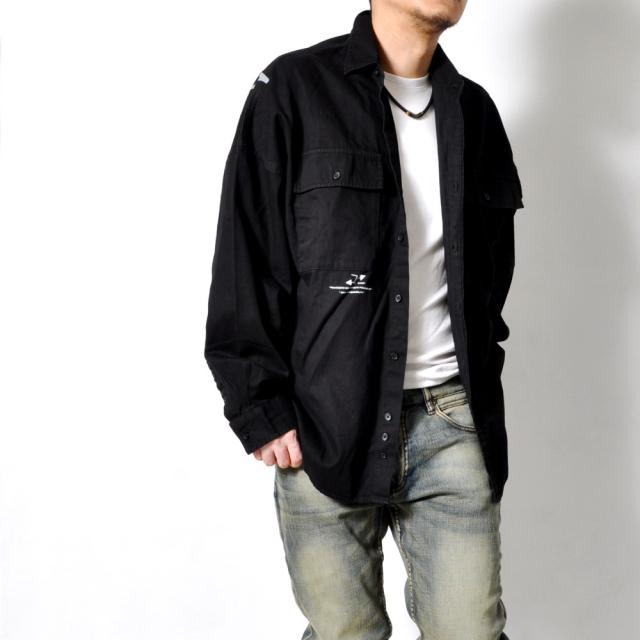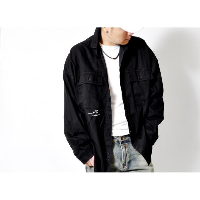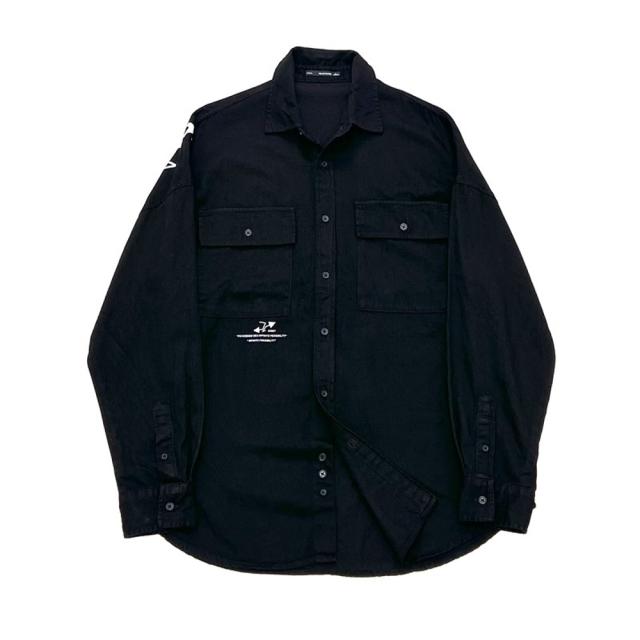シックに決まるブラックの長袖カジュアルシャツダブルチェストポケットに胸元のワンポイント、