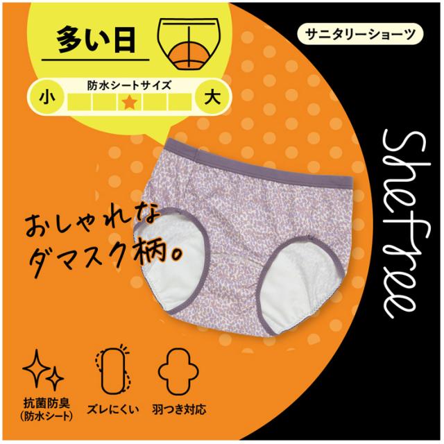 サニタリーショーツ アツギ Shefree 多い日 87430AS ダマスク柄 atsugi パンツ 下着 羽付き対応 生理用 パンティー(06005)