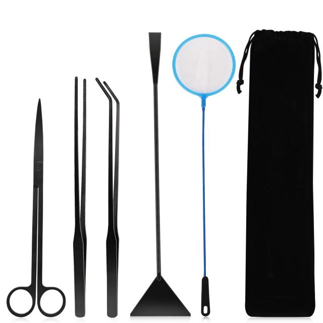 【6点セット】水槽での水草のトリミングや水草手入れに便利なピンセット・ハサミ・フィッシュネットの6点セットです。カーブハサミ(24.5cm)・ストレートピンセット(27cm)・カーブピンセット(27cm)・サンドフラッター(32.5cm)・フィッシュネット(32.5cmx7.5cm)・PH試験紙(80枚).使わない時に収納用の収納バッグも付属してます・