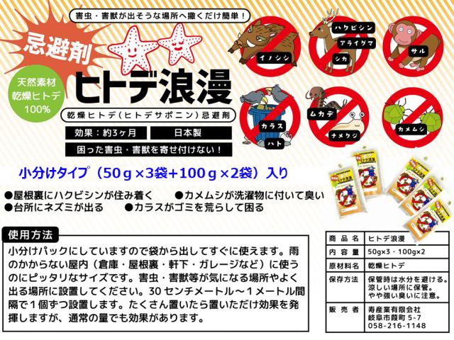忌避剤 乾燥ヒトデ100% 天然素材 困った害虫・害獣 土壌改良にも「ヒトデ浪漫 小分けタイプ(50g×3・100g×2)セット」