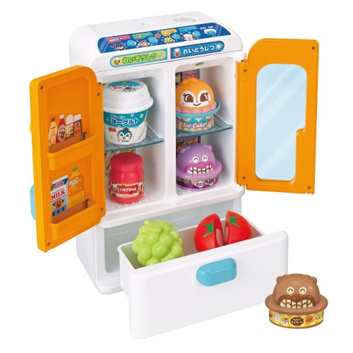 今までの開閉だけの遊びではなく、おままごとを盛り上げるにぎやかな冷蔵庫です