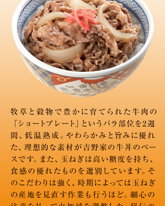 穀物肥育の北米産牛肉である「ショートプレート(バラ肉)」を使用。赤身と脂身が絶妙なバランスでマッチした、牛丼にぴったりのまろやかな肉質です。玉ねぎ本来の甘みと、深みのある味わいの秘伝のタレもこだわりのポイント。厳選した食材を使った牛丼の具です。