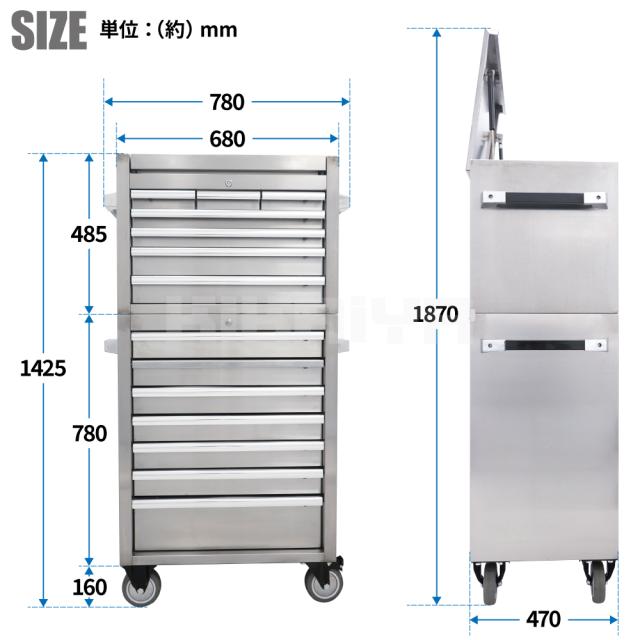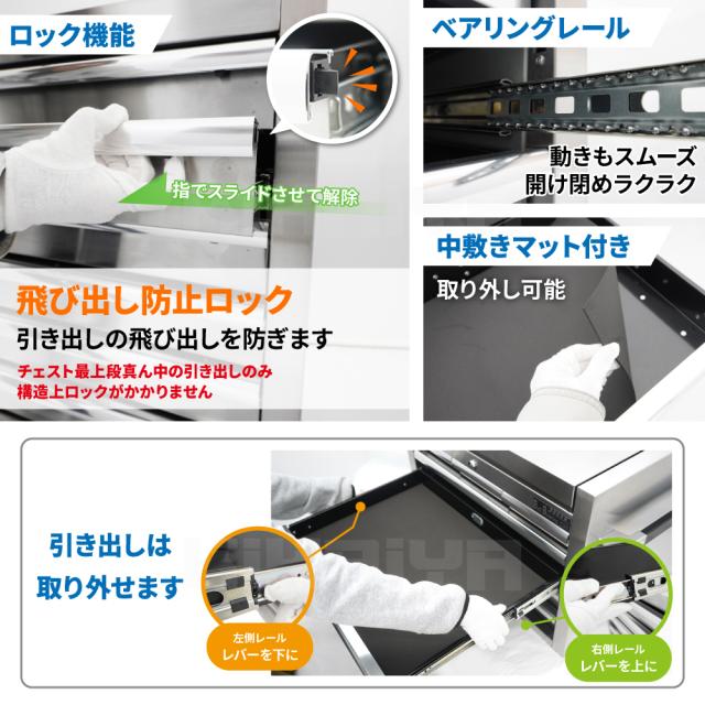 ステンレスは丈夫で傷がつきにくい! 無塗装なので色あせが無く長期間美しい外観を保つ! ●ステンレス製のキャビネットとチェストのセット商品です 付属の金具でキャビネットとチェストを固定してご使用ください ●引き出しの飛び出し防止ロック付き 取っ手右端のロックを指でスライドさせて解除します (チェスト最上段の真ん中の引き出しのみ構造上ロックがかかりません) ●引き出しは全段キーロックが可能です ●チェスト最上部トップパネルはガスダンパー付で自動に開きます ●収納全段に中敷きマットが付いております ●キャスターはTPR車輪で樹脂床に優しく、床を傷付けにくい ●両サイド大型ハンドル付き ●SUS430は磁性がありますので(磁石がつく)マグネットホルダー等が利用できます ●KIKAIYAロゴステッカー付き 大型ハンドル・キャスターはお客様での取付けとなります (必要工具:スパナ10mm、16mm・六角レンチ5mm) ※取付け工具は付属しておりません ※複数の引き出しを同時に引き出すと、キャビネットが倒れる恐れがありますのでご注意ください ★固定車輪を取り替えて、すべて自在車輪にする事が可能です (別売り)ステンレスキャビネット専用 自在キャスター 2個セット ★チェストとキャビネットは個別でもご購入いただけます ・ステンレスツールチェスト 5段 ・ステンレスキャビネット 7段 品番:SET-ST |
