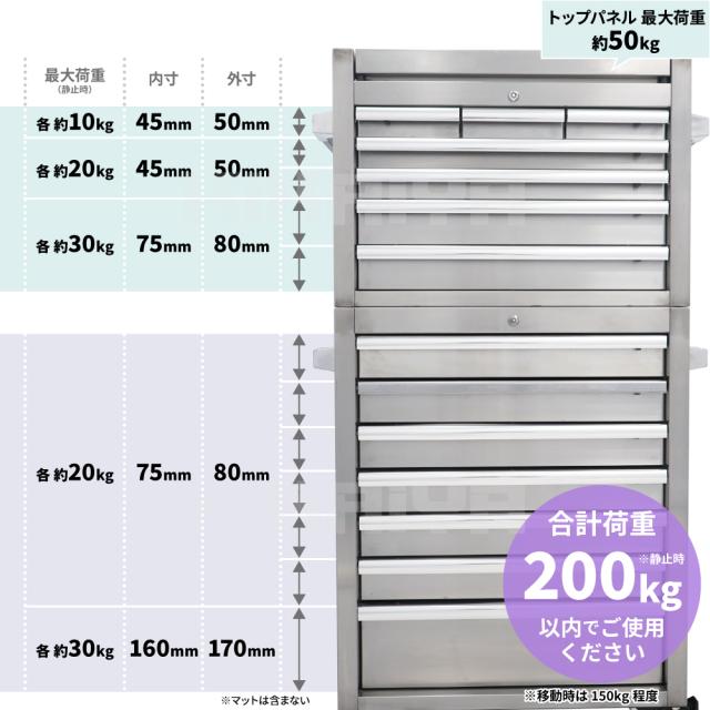 | 最大荷重(静止時) | 約200kg ※各引き出しの耐荷重は画像参照 |