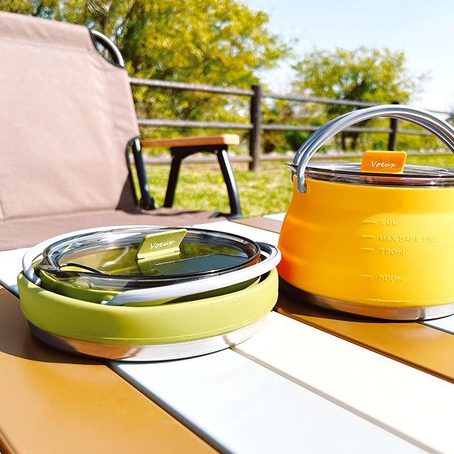 持ち運べるアウトドアギアとして画期的な折りたためる大容量ケトル!