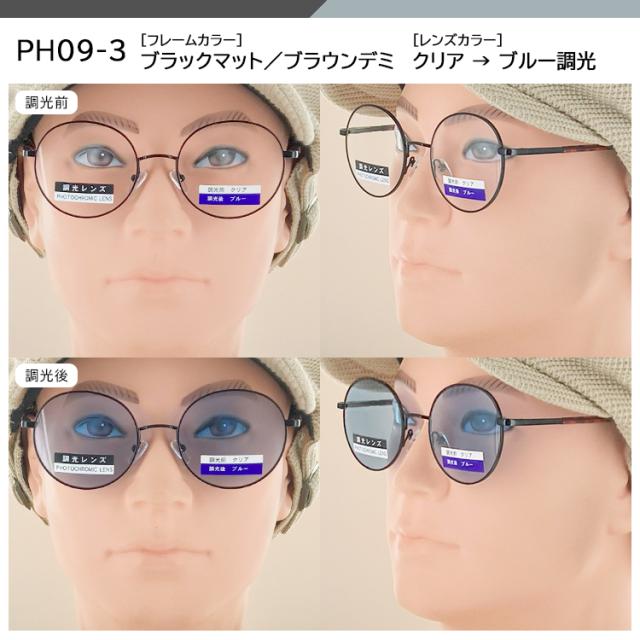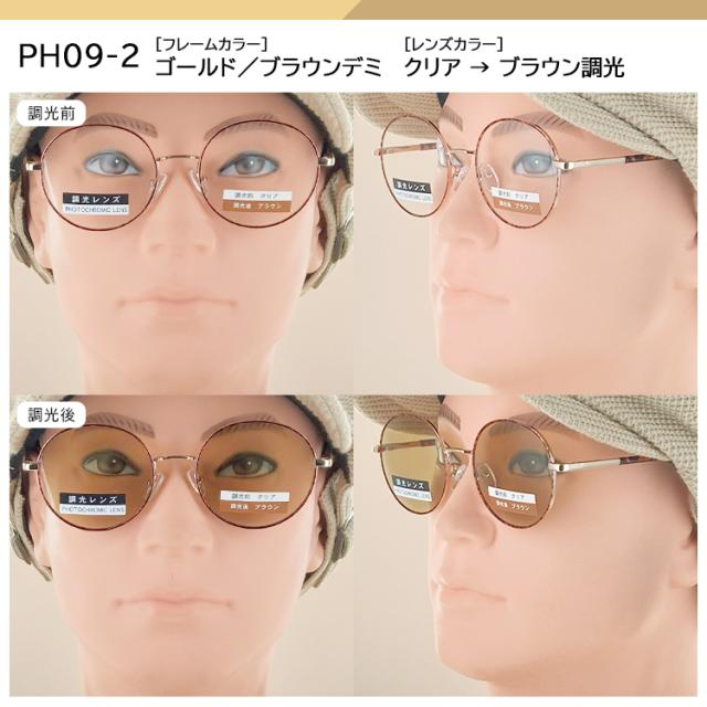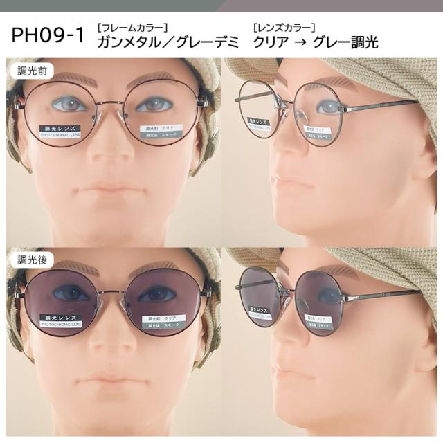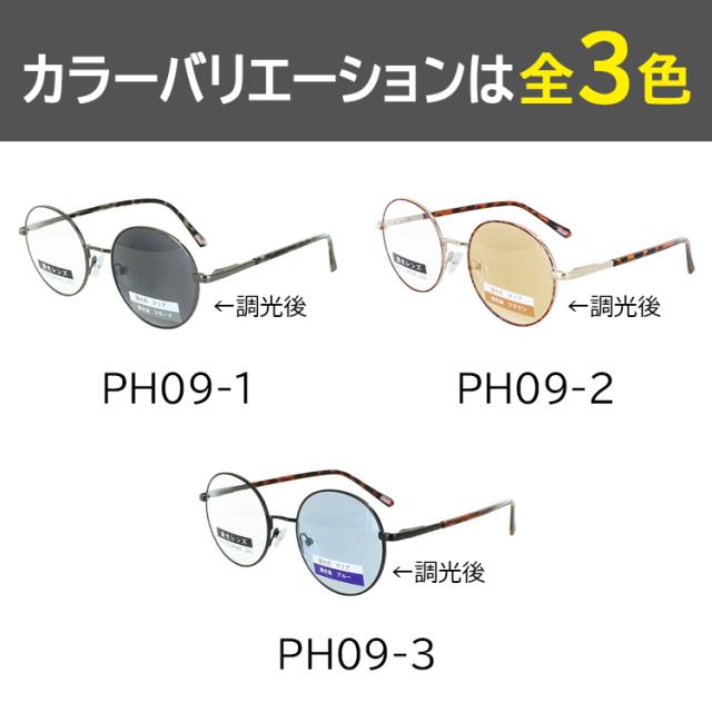 | ●カラー PH09-1 フレーム: ガンメタル/グレーデミ レンズ:クリア→グレー調光 PH09-2 フレーム:ゴールド/ブラウンデミ レンズ:クリア→ブラウン調光 PH09-3 フレーム:ブラックマット/ブラウンデミ レンズ:クリア→ブルー調光 | ●素材 フレーム:ニッケル合金 テンプル:ニッケル合金、プラスチック レンズ:プラスチック(調光レンズ) ●可視光線透過率 PH09-1 調光前 87%、調光後20% PH09-2 調光前 87%、調光後30% PH09-3 調光前 87%、調光後30% ●機能 調光レンズ バネ丁番 |