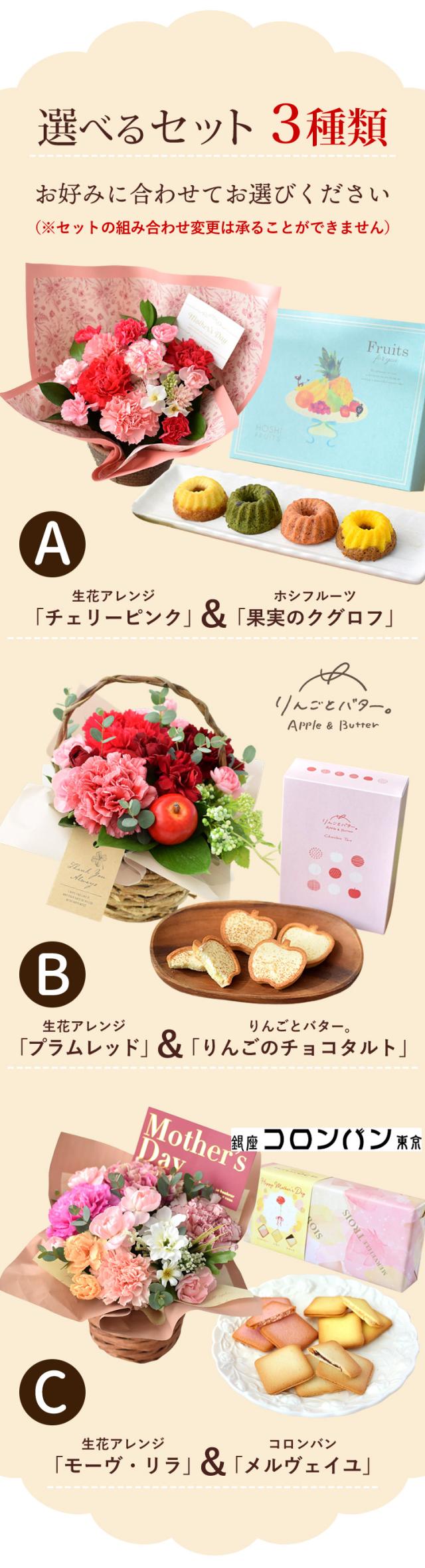 母の日 2026 花とスイーツ カーネーション 生花 アレンジメント スイーツ セット 3種「 ホシフルーツ 果実のクグロフ 」「 りんごとバター。 りんごのチョコタルト 」「 銀座コロンバン メルヴェイユ 」 洋菓子 セットギフト 母の日ギフト 花とお菓子
