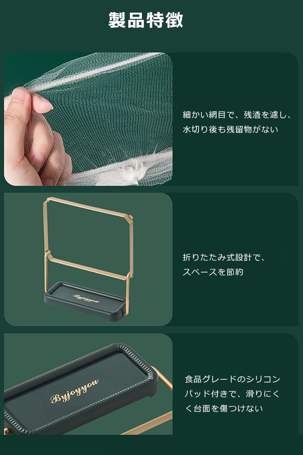 食べ残しや茶葉などの小さなゴミを簡単にキャッチし、シンクのつまりを防ぎます。 50枚の交換用ネット付きで、ゴミが溜まったら簡単に交換できます。 さらに、野菜や果物の水切りにも便利。使用しない時は折りたたんで収納でき、スペースを有効活用できます。