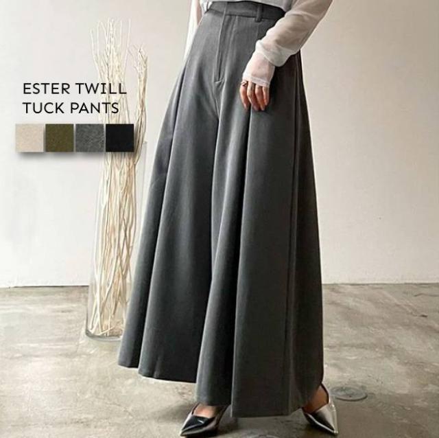 こちらの商品はきれいめな印象のエステルツイル素材のタックパンツになります。