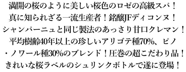 満開の桜のように美しい桜色のロゼの高級スパ! 真に知られざる一流生産者!銘醸JFディコンヌ! シャンパーニュと同じ製法の高級辛口クレマン! 平均樹齢40年以上の珍しいアリゴテ種70%、ピノ ・ノワール種30%のブレンド!まさにシャンパン と言っても過言ではない、圧巻の超こだわり品! きれいな桜ラベルのシュリンクボトルで遂に登場!