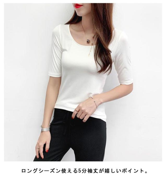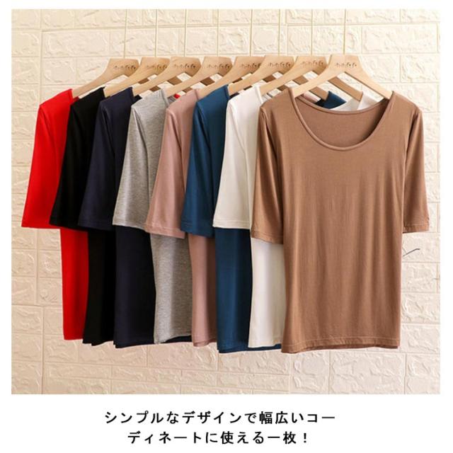 Tシャツ レディース 5分袖 春 夏 送料無料 襟ぐり広め トップス Uネック モーダル 送料無料 カットソー 無地 インナー 肌着 シンプル 薄手 ストレッチ 吸湿性 通気性