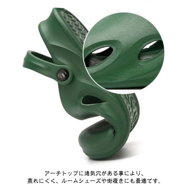 | クッション性もよく、軽量なサンダルです。 履き心地も良く履いていくうちに足に馴染みフィット感も抜群です! ヒールストラップがついているのでホールド性も良く、前に倒せばスリップオンサンダルに。 アーチトップに通気穴がある事により、蒸れにくく、ルームシューズや街履きにも最適です。 | |