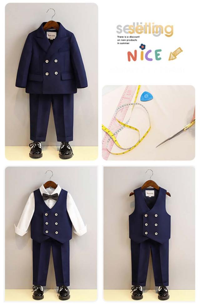 | 男の子フォーマルスーツ6点セット(ジャケット+シャツ+パンツ+ベスト+蝶ネクタイ+コサージュ) 卒園式や入学式、冠婚葬祭におすすめ! 少し光沢のあるしっかりとした上質な素材を使用しています。 スラっとシンプルなロングパンツが大人っぽいフォーマルスーツです。 シャツ、蝶ネクタイ、コサージュもセットになっていて、コーディネートに困りません◎ | |