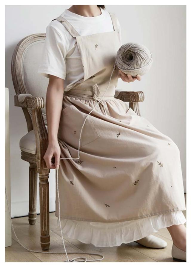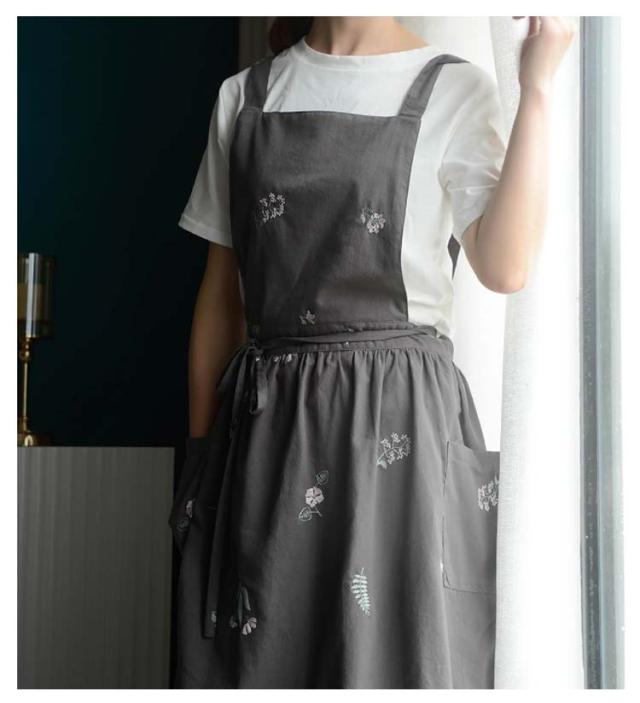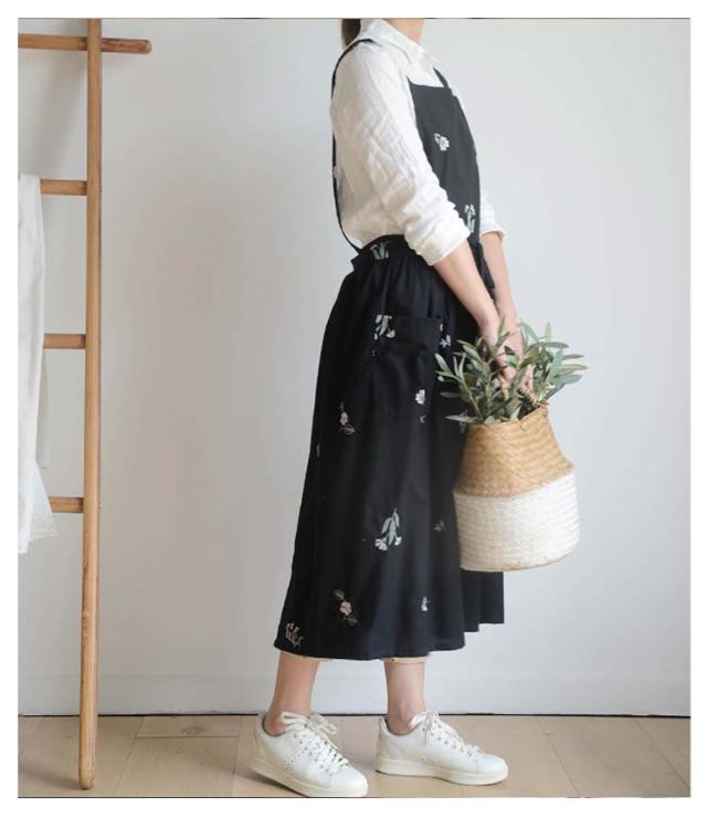 | 刺?デザインの綿エプロン、通年使えます。 ポケットが横についているので、屈んだときに入れたものを落とさずにすみます。 太めの肩紐のデザインで、肩への圧迫が減ります。 結婚祝いや敬老の日等プレゼントにも最適です。 | |