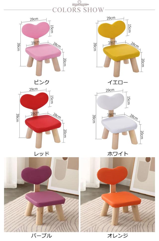 | おしゃれ ハート型 カバー洗える ハート型可愛い子供用椅子。 安定した八の字脚、脚部は、やや下に広がるように八の字のフォルムで、しっかりと支え、転倒しにくい形。 内部は柔らかいスポンジ充填で、長時間座っていても疲れない。 木製の脚の底には傷防止と滑り止めが付いています。 カバーは外して洗濯機で洗えます。 お子様の宿題や手洗い椅子としてはもちろん、踏み台など使い方様々なアイテムになれます。 | |