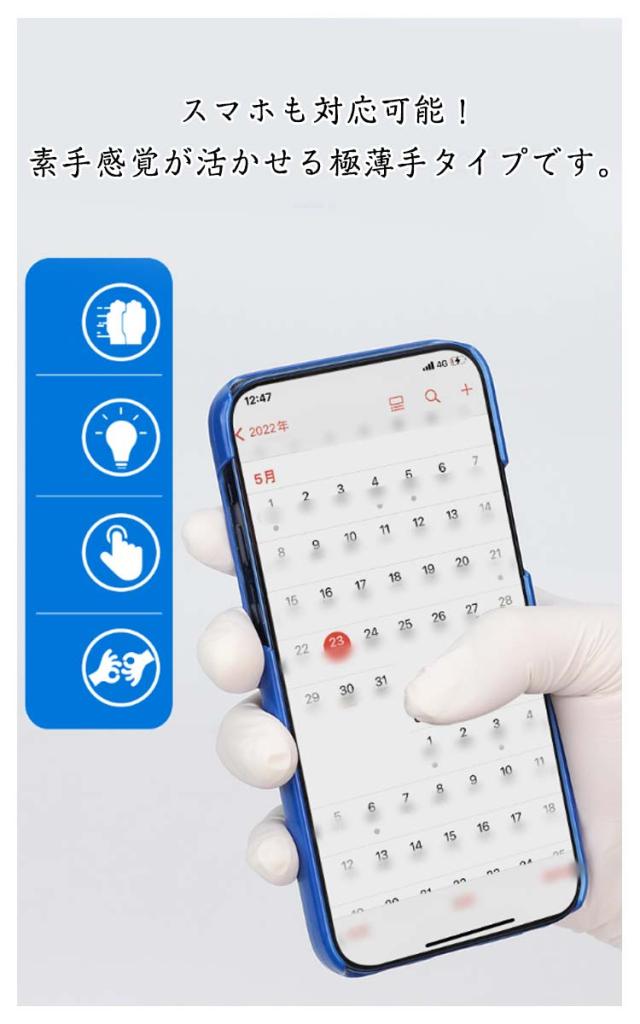 | 左右兼用のため、片手でも使えて経済的なニトリル手袋です。 伸縮性があり、手にフィットするため、長時間の作業にも適しています。 パウダーフリーで指先の細かい作業にもぴったりで、作業効率を高めます。 ニトリルゴム製なので、耐引き裂き性・耐突き刺し性・耐摩耗性に優れています。 薄く手にぴったりフィットするため、細かい作業に適しています。 スマホも対応可能!素手感覚が活かせる極薄手タイプです。 食品加工など食品に直接触れる作業でもお使いいただけます。 | |