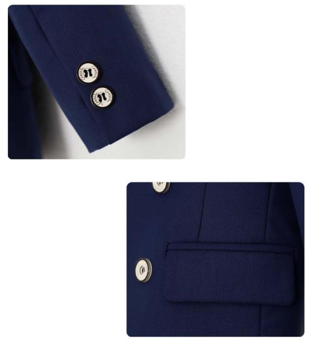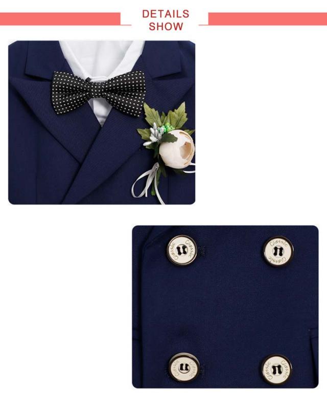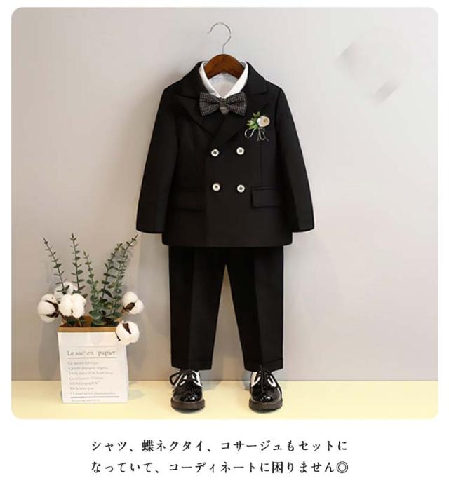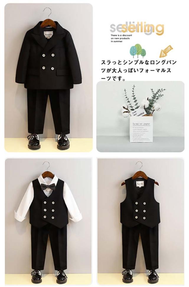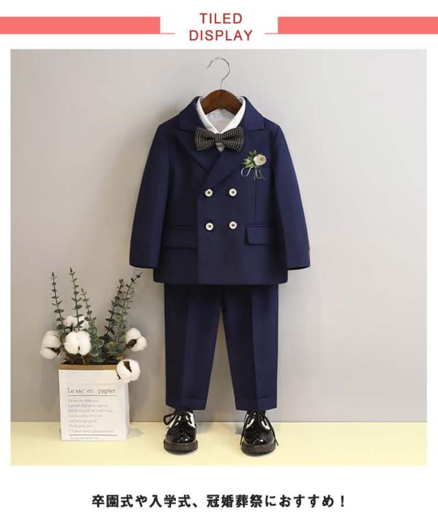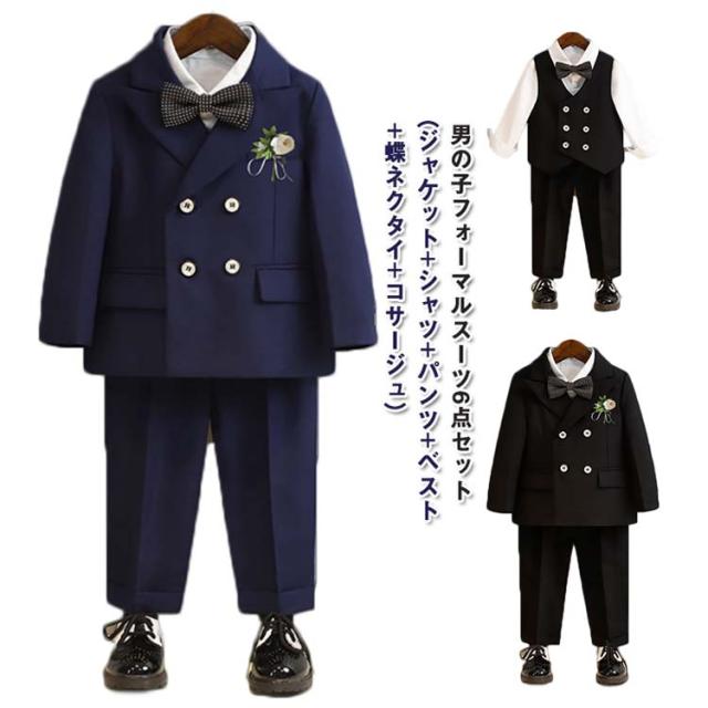 | 男の子フォーマルスーツ6点セット(ジャケット+シャツ+パンツ+ベスト+蝶ネクタイ+コサージュ) 卒園式や入学式、冠婚葬祭におすすめ! 少し光沢のあるしっかりとした上質な素材を使用しています。 スラっとシンプルなロングパンツが大人っぽいフォーマルスーツです。 シャツ、蝶ネクタイ、コサージュもセットになっていて、コーディネートに困りません◎ | |