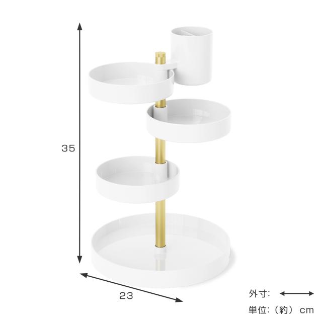 散らかりがちな化粧品や化粧道具など細々した小物類をスッキリまとめて収納できる、360度回転する収納トレイです。トレイが土台を含めて5つ備えているため収納力が高く、限られたスペースでも省スペースに沢山収納することができます。すっきりとしたフォルムにホワイトカラーのシンプルなデザインは、リビングや寝室、洗面所など場所を問わずお使い頂けます。