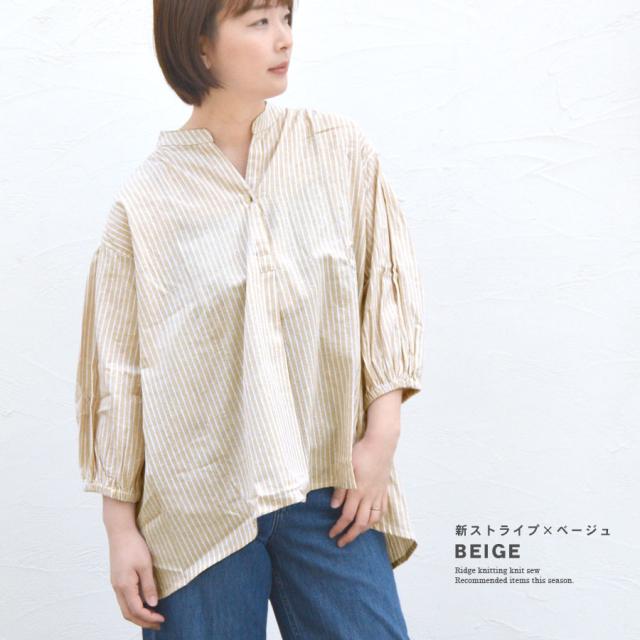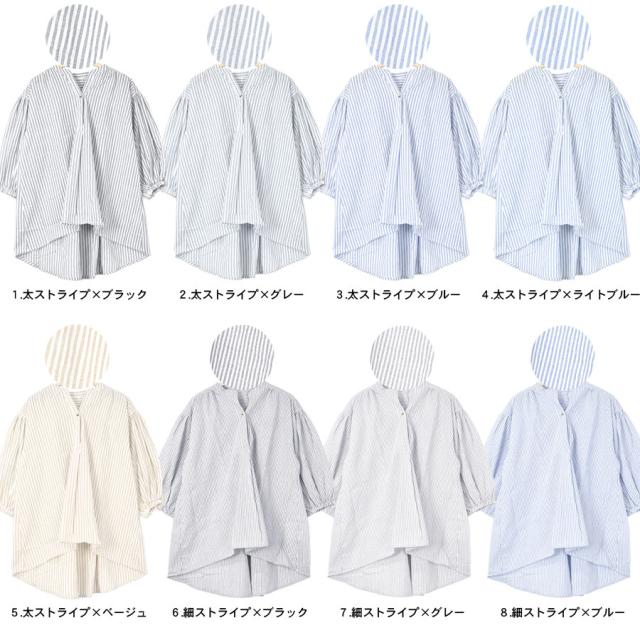 【シャツ ブラウス スキッパーシャツ インド綿 綿100% 七分袖 ストライプ柄 レディース トップス バンドカラー チュニック 前後丈違い ギャザー ふんわり ボリューム袖 体型カバー ワイド ゆったり ロング丈 春 五分袖 オフィスカジュアル オフィス】