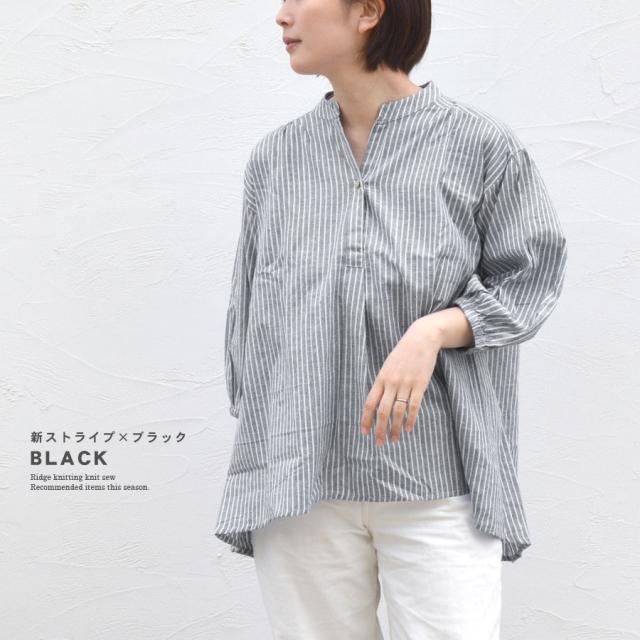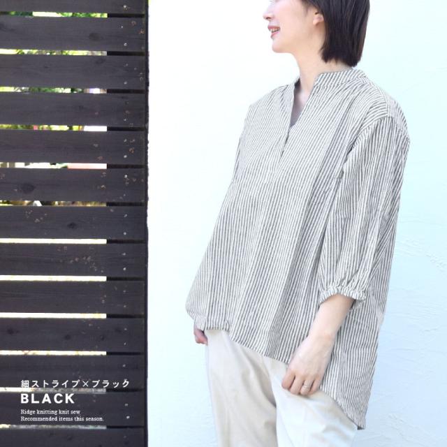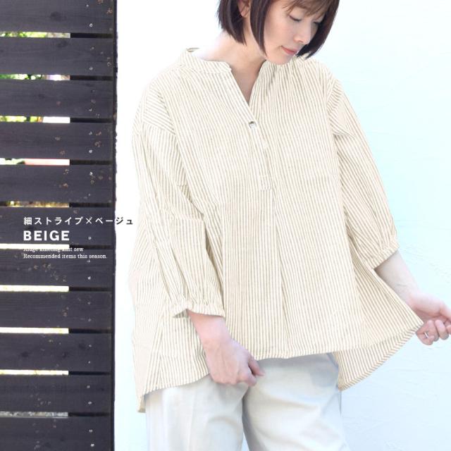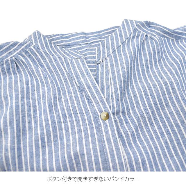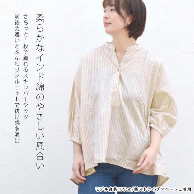 シャツ ブラウス スキッパーシャツ インド綿 綿100% 七分袖 ストライプ柄 レディース トップス バンドカラー (bc0159)