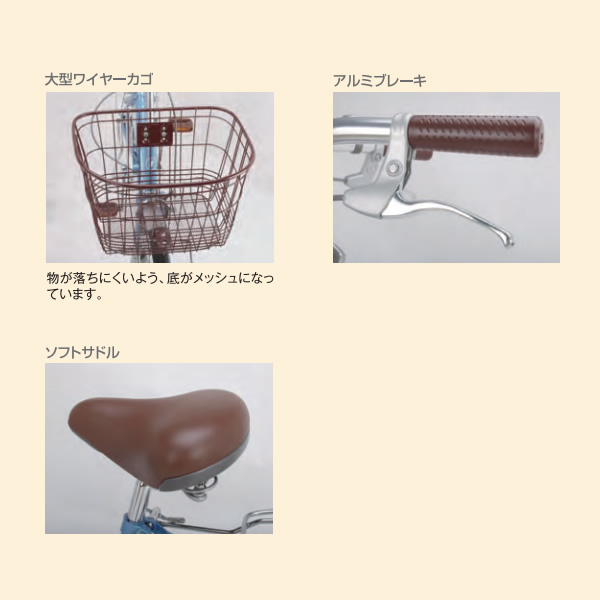 ■その他:アルミハンドル/アルミブレーキレバー/スーパーソフトサドル/丸大型ワイヤカゴ