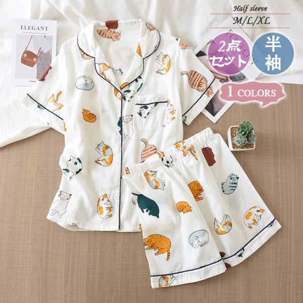パジャマ レディース 夏 半袖 ルームウェア 前開き おしゃれ 猫柄 綿 折り襟 2点セット 夏用 コットン 寝巻き 上下セット ナイトウェア 部屋着