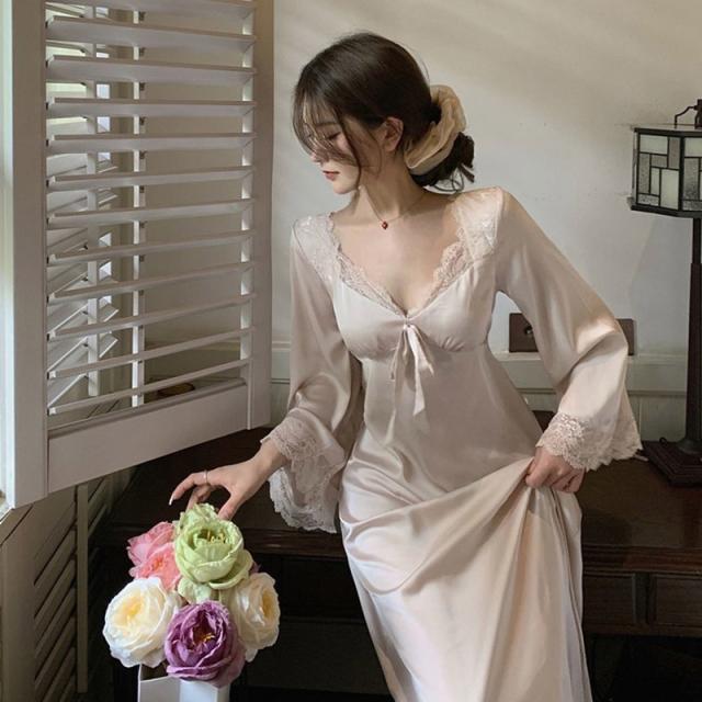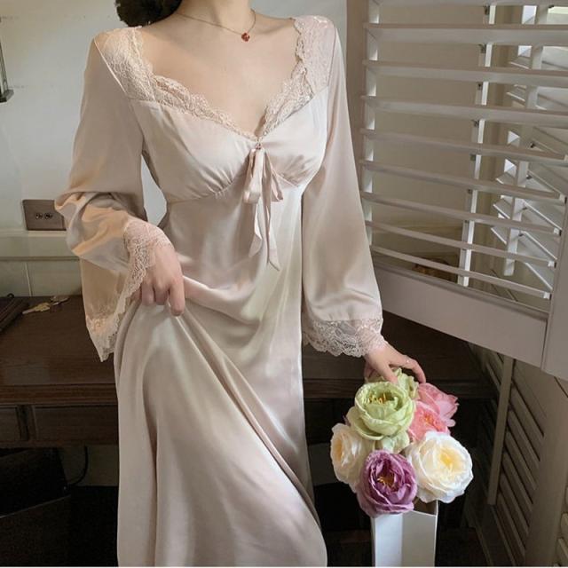 ネグリジェ 春夏秋 長袖ネグリジェ 姫風ワンピース ロング丈 レースVネックネグリジェ ナイトロープ ルームウェア レションパジャマ レディース 大人