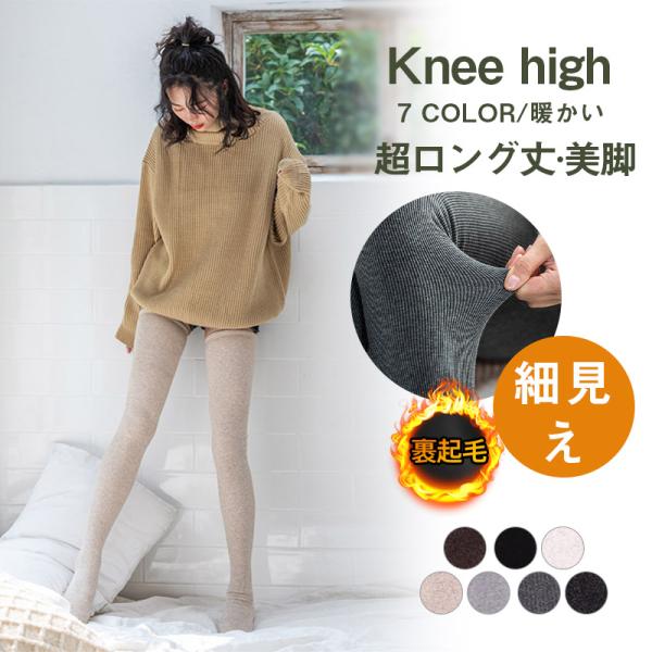 リブ編みが可愛らしい雰囲気を作り出し、足のラインを細く長く見せて美脚効果が抜群!膝上丈でスカートに最適です。