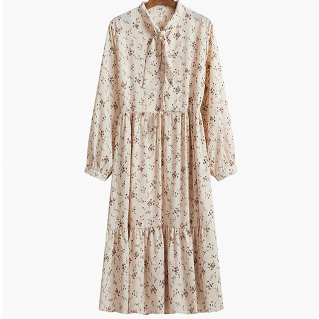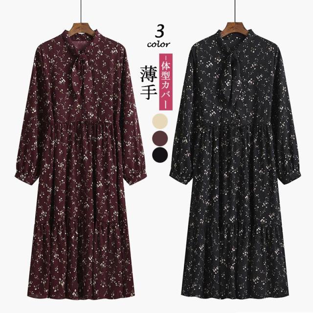ワンピース 花柄ワンピース シフォンワンピース ひざ丈ワンピース Aラインワンピース 長袖 リボン 着痩せ 細身 ゆったり おしゃれ 大人 可愛い