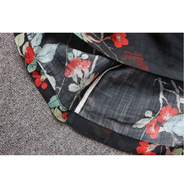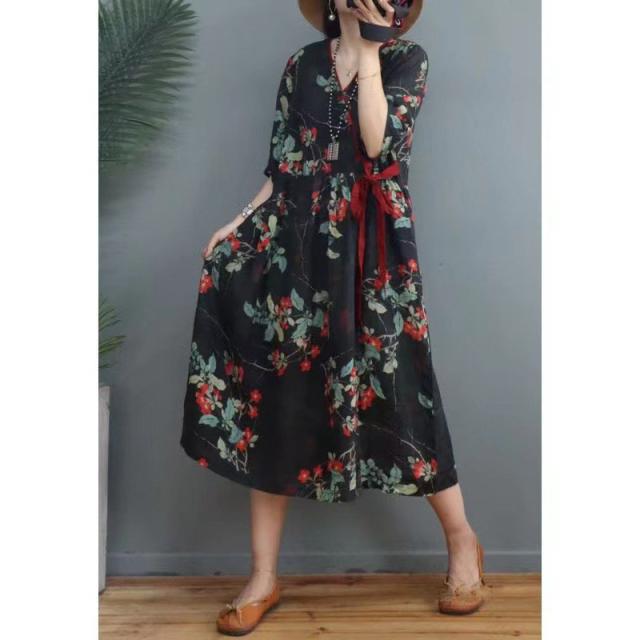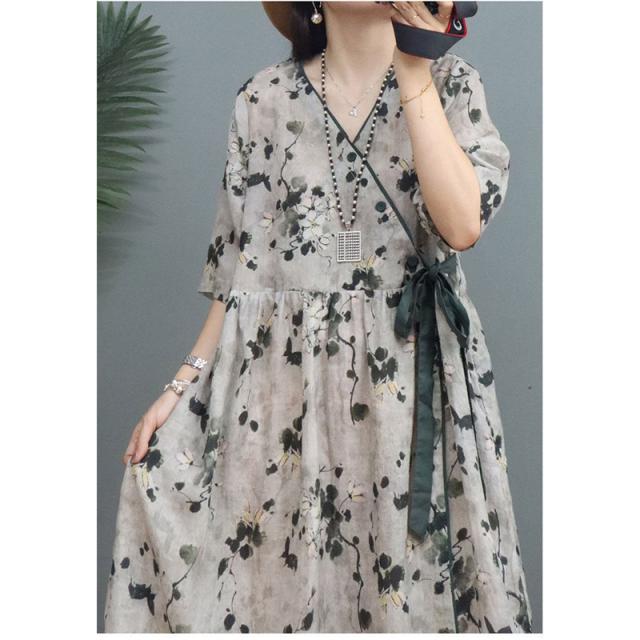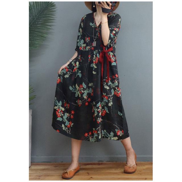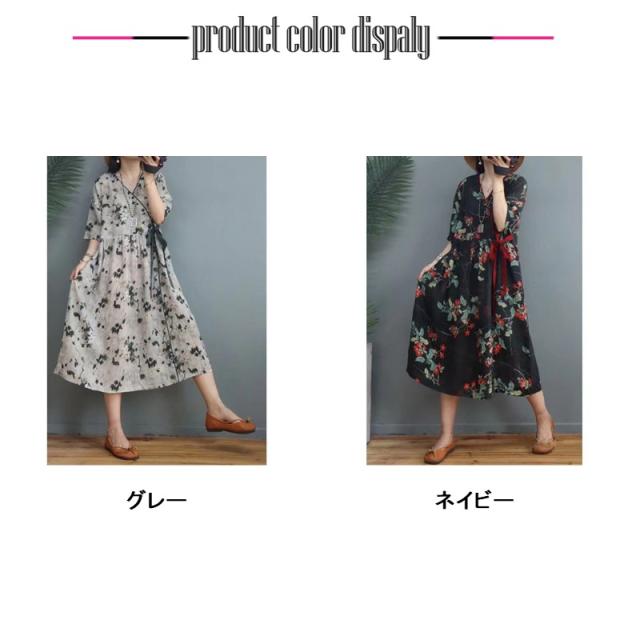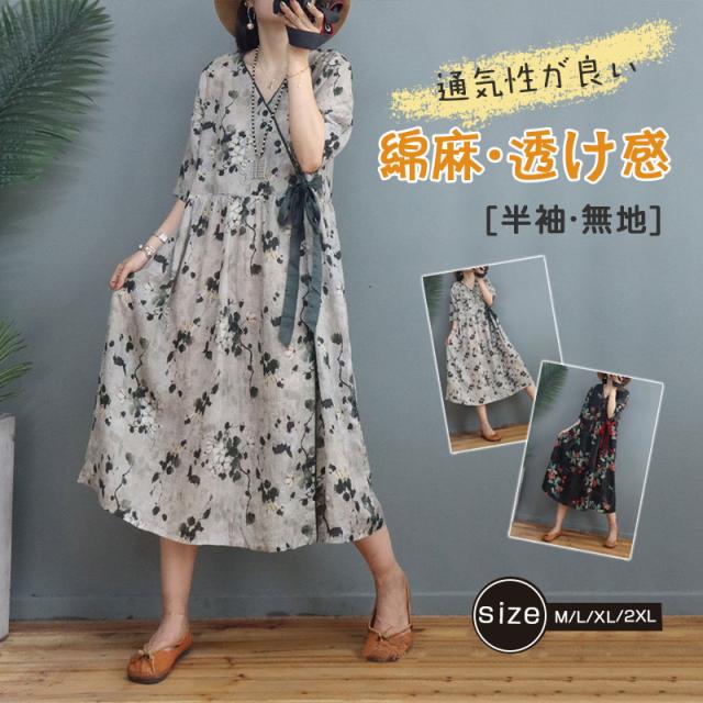 ワンピース 秋 ロングワンピース 綿麻 花柄 プリント リゾート 半袖 大きいサイズ カジュアル 大人 春 夏 ゆったり 体型カバー おしゃれ