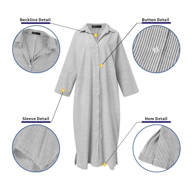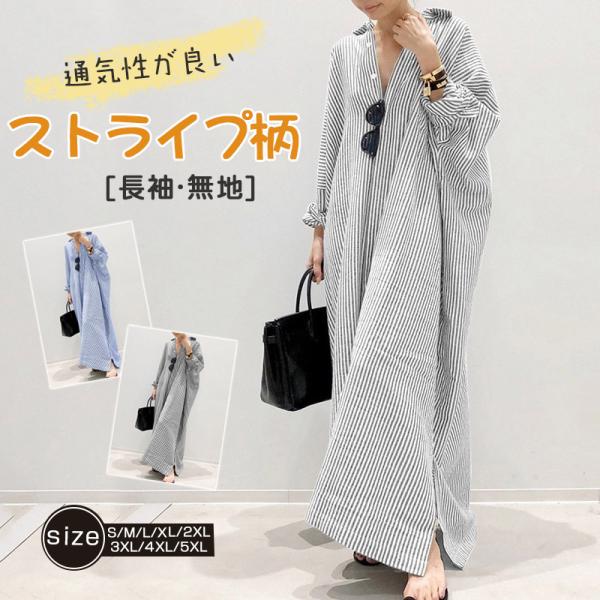 マキシワンピース レディース ロングワンピース 長袖 シャツワンピ 大きいサイズ チュニック ロング丈 ストライプ柄 体型カバー ゆったり 着痩せ
