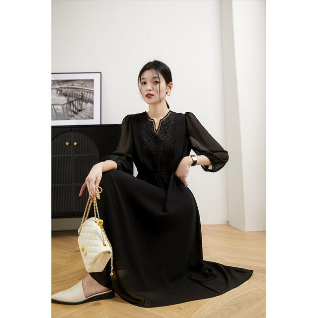 ワンピース ロングワンピース 結婚式 刺繍 長袖 フレア レディース 大きいサイズ フォーマル 黒 ロング パーティドレス きれいめ 春 秋