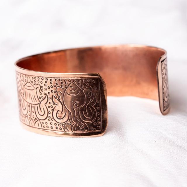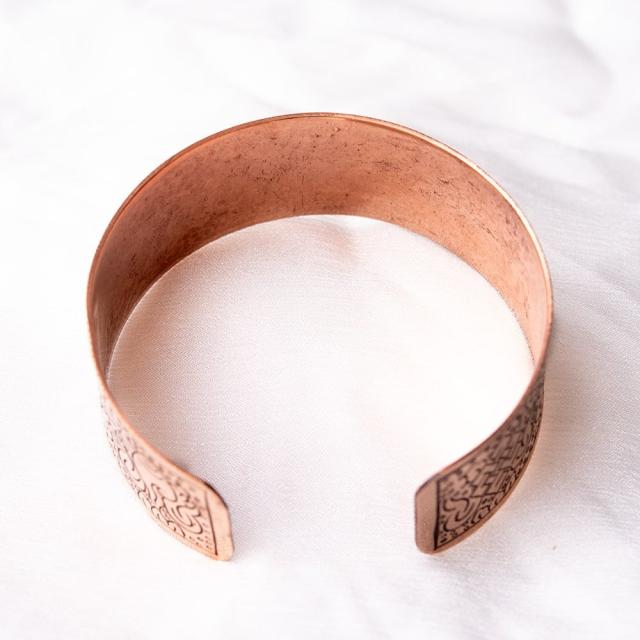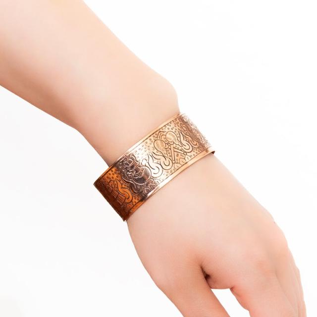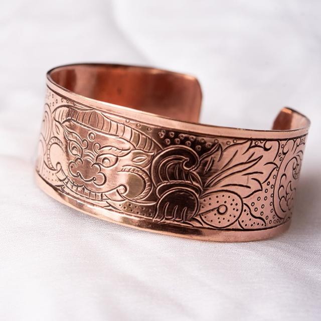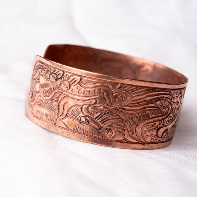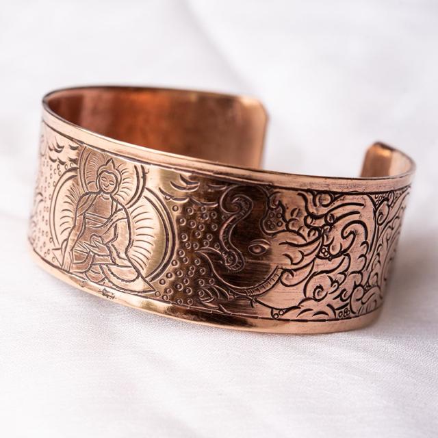 メタルの存在感のあるバングルです。チベットの吉祥文様が彫られていてシンプルなデザインながらお手元のポイントになっております。■チベットの幸運のシンボルがたっぷり