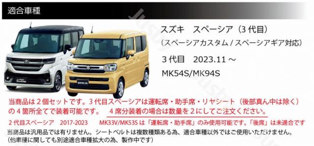 当商品は2個セットです。スペーシアは運転席&助手席及び後部座席×2も装着可能です。 4席とも装着希望の場合は数量2にてご注文ください。