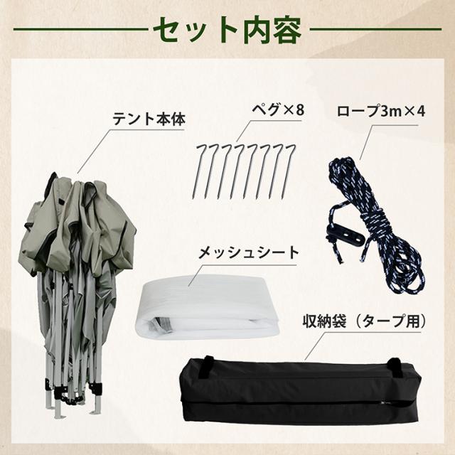 ・商品内容:テント本体/メッシュシート/ペグ×8/3mロープ×4/収納袋(タープ用)