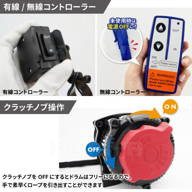 アウトドア・レジャー・現場作業など 重量物を牽引&引き上げる際に大活躍! ●DC12Vバッテリーに繋げて使用する、電動ウインチです ※車のバッテリーに繋げてご使用の場合はエンジンを作動させた状態にしてください ●狩猟の際の獲物回収、スタック車両の救出、材木の引っ張り出しなどにも使えます ●牽引能力は6000LBSとハイパワーでありながらも本体は7.45kgの軽量デザイン 幅広い車種に設置いただけます ●有線コントローラーはもちろん、無線コントローラーも付いているので、 本体から離れてのウインチコントロールが可能です ●無線コントローラーは、ウインチの様子が確認できる位置(30m以内)、 状況でご使用ください (無線到達可能距離:約60〜70m) ●シンセティック(合成)ロープは引っぱりに強く、軽くて扱い易いです ●ロープはダークグレーカラーで汚れが目立ちにくいです ●クラッチノブをOFFにするとドラムはフリーになるので、手で素早くロープを 引き出す事ができます ≪ご注意≫ ※必ず12Vバッテリーに直接つないでください 充電器・インバーター等に接続してもご使用いただけませんのでご注意ください ※本製品は水平に牽引する仕様のものです、上下の荷揚げはできません ※ロープを鋭利な物で傷つけたり、擦らせたりしないでください ※必要に応じてマウント用プレートに追加の穴をあけてご使用ください ※製品はお客様の自己責任にて、確実なお取り付けをお願いいたします 【付属品】 ・有線/無線コントローラー ・コントロールボックスアセンブリ ・バッテリー側配線 ・モーター側配線 ・マウント用プレート ・フック ・プルストラップ ・フェアリード ・端子ブーツ ・取付用ボルト類 各種 ※取り付けに異なるサイズのボルトやナット、ワッシャーが必要な場合はお客様でご用意いただきますようお願いいたします ※入荷時期によりデザインや仕様が一部変更になる場合があります ご使用に問題のない場合(返品/交換)はお受けしておりませんのでご了承ください 品番:DC12V-10 |