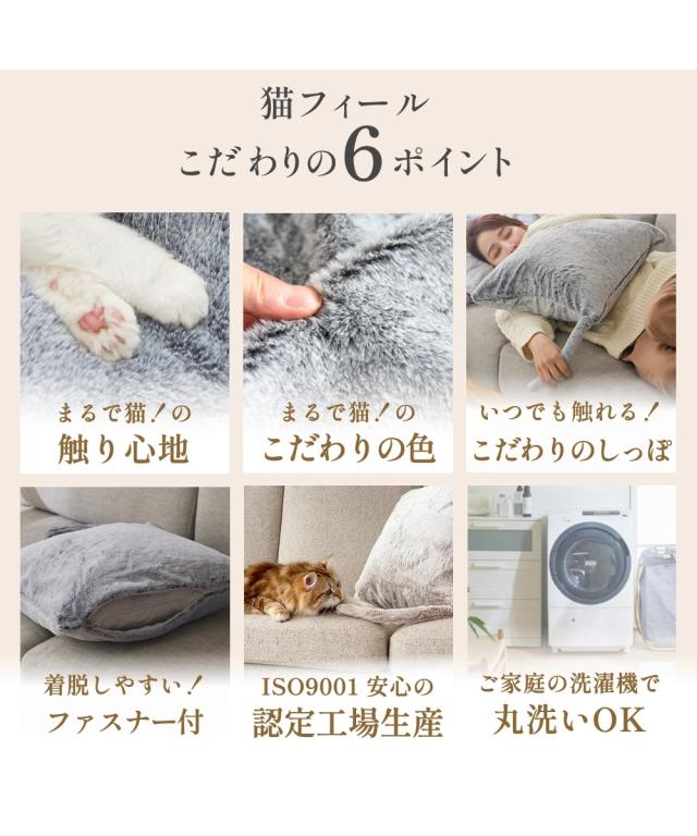 【猫Feel/ねこフィール】猫好きなのに触れない・・・。猫の癒しを求めて「全然触れない猫カフェ」に通う猫好きスタッフの週末。同じように毎日触りたいけど触れない方がいるのではというのがきっかけで商品企画に。試行錯誤してついに「まるで猫に触っているような肌触りの商品=猫フィール」が出来上がりました!猫好きなのに、住宅事情やアレルギーなどで飼えない・触れないという方、ぜひ「猫フィール」で願望をかなえてくださいね。■商品特徴SNSで話題!まるで猫のような肌ざわりの猫Feelシリーズから、日常的に使いやすいクッションカバーが誕生。ソファーでもベッドでも、いつでもしっぽスリスリが実現できる!いつものクッションが、まるで猫に早変わり!まるで猫のようなモフモフな肌触りに、ぜひ癒されてください。