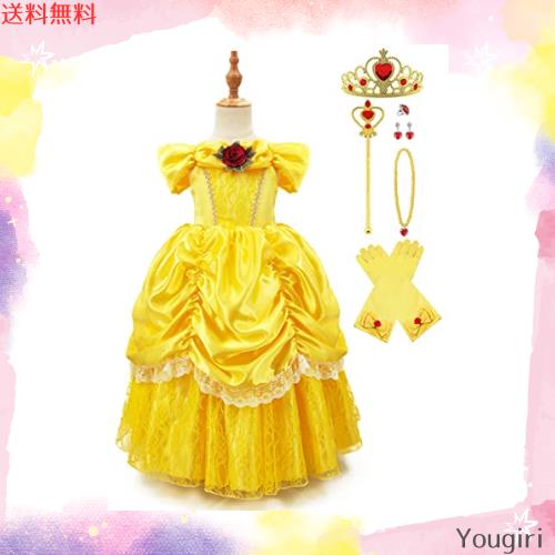 [Axaxa] ベル ドレス 子供 プリンセス ドレス キッズ コスチューム (美女と野獣風ドレス, グローブ, ティアラ,ステッキなど)豪華7点セッ