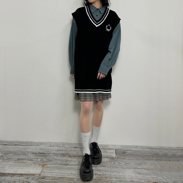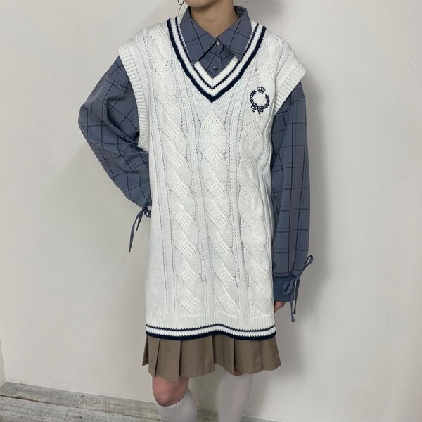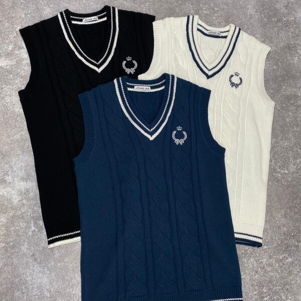 配色ラインと大き目のケーブル編みに目が惹くニットベストが登場!