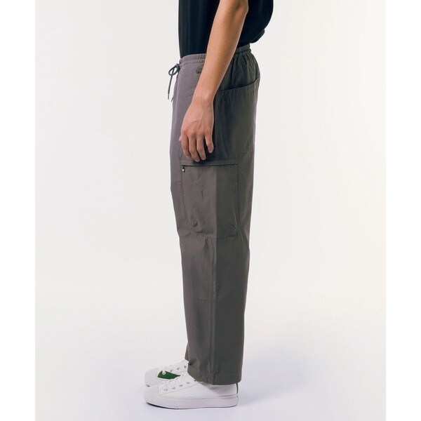コーティングされたような表面感のナイロンコットンツイル素材がスポーティな魅力を高め、はめ込み型のサイドポケットで 少しすっきりとした印象に仕上げたカーゴパンツ。裾口に入れたバンジーコードでシルエットのアレンジも楽しめ、フットウェアを選びません。